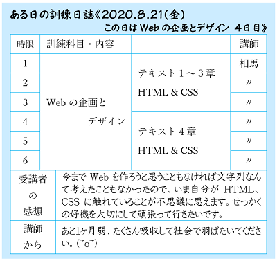 Excelの学習から始まった訓練は4ヶ月目の現在、Web制作言語(HTML)の学習に入りました。今後はCSSと呼ばれるスタイルシートの作り方やWordpress(世界でいちばん使われているWebサイトをカンタンに作るツール)の使い方を学びます。その後、卒業制作のホームページを作ります。